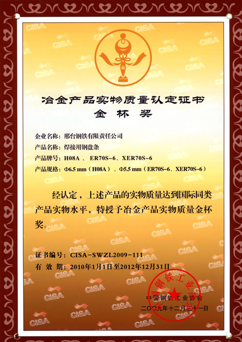 焊接用鋼盤條H08A、ER70S-6、XER40S-6獲冶金產(chǎn)品實物質(zhì)量金杯獎