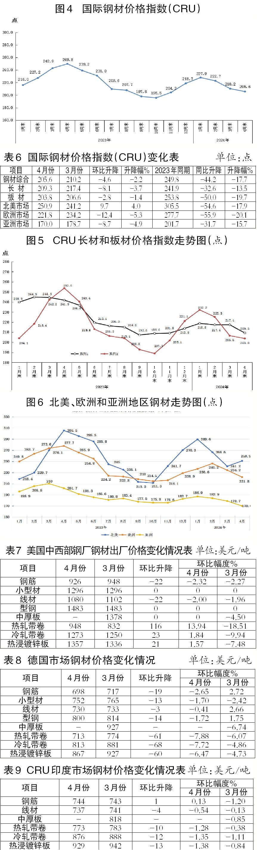 4月份,CRU國(guó)際鋼材價(jià)格指數(shù)為205.6點(diǎn),環(huán)比下降4.6點(diǎn),降幅為2.2%,連續(xù)3個(gè)月下降;同比下降44.2點(diǎn),降幅為17.7%。